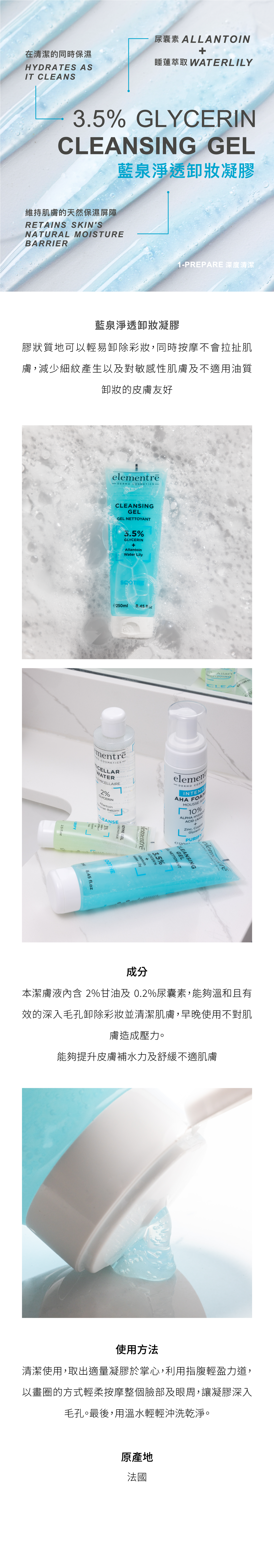 膠狀質地可以輕易卸除彩妝,同時按摩不會拉扯肌膚,減少細紋產生以及對敏感性肌膚及不適用油質卸妝的皮膚友好